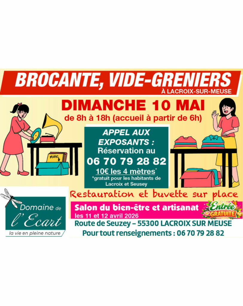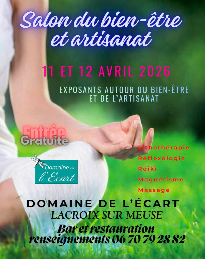 ÉVÉNEMENTSau Domaine de l’Ecart Saison 2026En partenariat avec l’Association Marguerite Coraps, nous vous proposons des activités variées qui ponctuent l’année SALON DU BIEN-ETRE ET ARTISANATSamedi et dimanche 11 et 12 avril 2026 Brocante 2026Dimanche 10 MAI 2026 de 8h à 18h Partager : Partager sur Facebook(ouvre dans une nouvelle fenêtre) Facebook Partager sur X(ouvre dans une nouvelle fenêtre) X